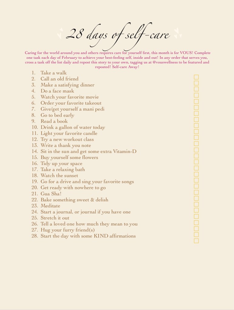 On top of school this quarter, I have been interning for Vous Wellness- a massage therapy brand founded and ran by Kendall Drozda. My primary duty is to maintain and update the Instagram page, and occasionally create content for the account. Last month, the theme was “Self-care is not Selfish.” With this, I created a template demonstrating 28 ways to practice self-care and increase time outdoors, or with yourself/loved ones. While I participated in the challenge myself, I found my mental health to improve, and feel much more at-peace and calm than I did before. I give credit to the activities I did such as cooking, taking a walk, or even taking a drive with music- all things that I would normally spend those minutes scrolling through social media.